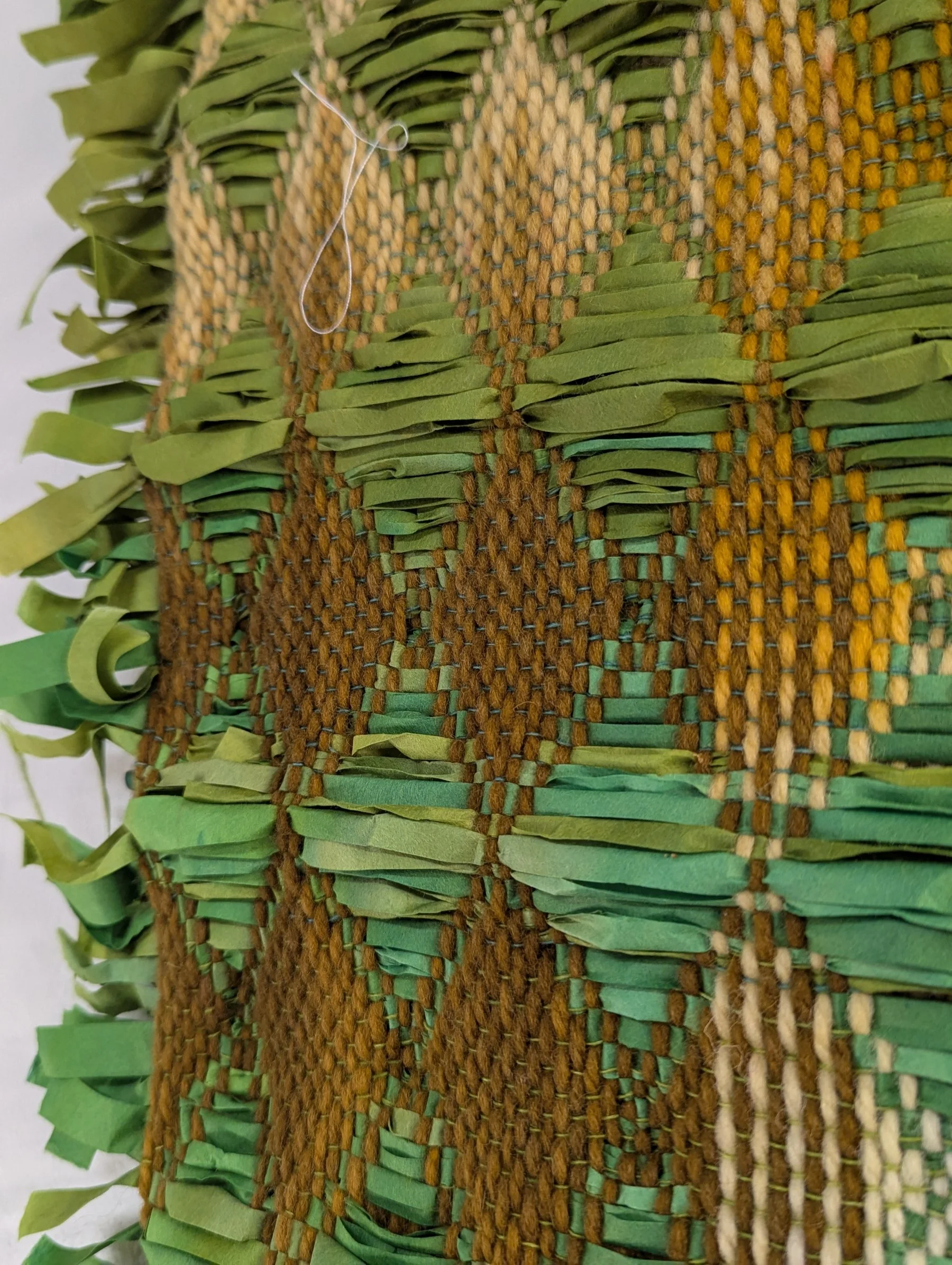 Connecting Threads is a collaboration between textile artist Stephen Tornero and fashion designer Stephen Drake based on their shared love of textiles and fashion. Drake is a skilled tailor who enjoys working with old textiles and garments, giving them new life and purpose. Tornero is a weaver who creates textile work within the fiber shed of Ohio, keeping a low carbon footprint. In addition to their shared interest in sustainable production, they also both enjoy bold patterns and punchy colors. The work in the show celebrates this collaboration between these two creatives, celebrating the connections between their two practices.